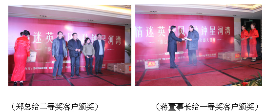 為回饋廣大準(zhǔn)業(yè)主對(duì)泰達(dá)星河灣的厚愛(ài),這次活動(dòng)主辦方特別安排了抽獎(jiǎng)環(huán)節(jié),分別設(shè)有一、二、三等獎(jiǎng),其中一等獎(jiǎng)1名,獎(jiǎng)品為IPAD2平板電腦,二、三等獎(jiǎng)獎(jiǎng)品豐厚,抽獎(jiǎng)也將現(xiàn)場(chǎng)的氣氛再一次帶到高潮。 最后在頒獎(jiǎng)中,本次活動(dòng)圓滿結(jié)束